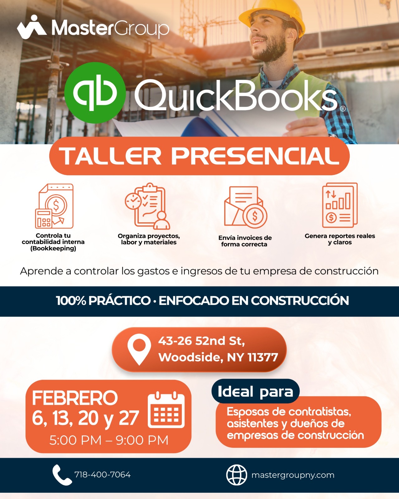 El Taller Presencial de QuickBooks de Master Group está diseñado para ayudarte a controlar de forma clara y organizada los ingresos y gastos de tu empresa de construcción, utilizando QuickBooks de manera práctica y aplicada a la realidad del sector.